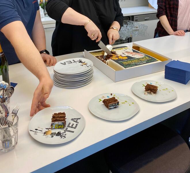 Im Anschluss wurden Jason Dark die kreativen Fan-Glückwünsche überreicht, die vorab zahlreich eingegangen waren. Für alle Gäste und das Geburtstagskind gab es noch ein Stück Schokotorte – diese zierte ein fast echtes John Sinclair-Romanheftcover mit Jason Darks Konterfei und einer entflammten 75.