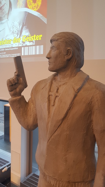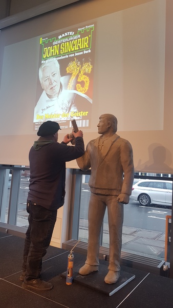 Doch der Überraschungsbesuch des langjährigen Weggefährten war noch nicht alles: Er hatte auch ein ganz besonderes Geschenk dabei. Eine lebensgroße John Sinclair-Skulptur aus Styrodur wurde enthüllt, die Yakup eigens zum 75. Geburtstag für Jason modelliert hat. Jason Dark und seine Frau Roswitha und hatten direkt eine Idee, wo die Statue einen Platz finden soll: In ihrem heimischen Garten in Bergisch Gladbach, „weil sich dort in letzter Zeit dubiose Gestalten umhertreiben…“ (Doch nicht etwa Dämonen, Werwolfe oder Vampire?) ;)