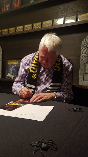 Moderator Mike Litt begrüßte auf der Bühne auch Sinclair-Fan Bülent, der die Crowdfunding-Kampagne für die limitierte Tonstudio Braun-Schallplatte „Das Horror Schloss im Spessart“ ins Leben gerufen hat. Die LPs waren am aufgebauten Fan-Artikel-Stand sofort vergriffen und Jason Dark und Dietmar Wunder waren unermüdlich im Einsatz, um alle neu erworbenen und mitgebrachten Lieblingsstücke zu signieren. Außerdem las Dietmar Wunder einen Auszug aus der Gewinner-Fan-Geschichte „Feuertanz“ von Thomas Williams – diese ist ab dem 8. November 2019 in voller Länge im Podcast für dich online.
