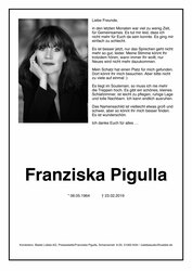 Franziska Pigulla ist von uns gegangen. Sie starb am Samstag, 23.02.2019, mit gerade einmal 54 Jahren. Sie war eine begnadete Schauspielerin mit der wohl außergewöhnlichsten Stimme, die es auf Hörbüchern, in Hörspielen, im Kino und Fernsehen zu hören gab. Aber Franziska war für uns noch viel mehr. Sie war eine richtig gute, eine echte Freundin, lebenslustig, witzig, spontan, kreativ und seit über 20 Jahren Teil unserer kleinen Lübbe-Familie. Vor dem Studio-Mikro oder auf unseren vielfachen Veranstaltungen, wie Fantreffen, Verleihungen Goldener Schallplatten, Partys, Livelesungen oder Buchmessen.